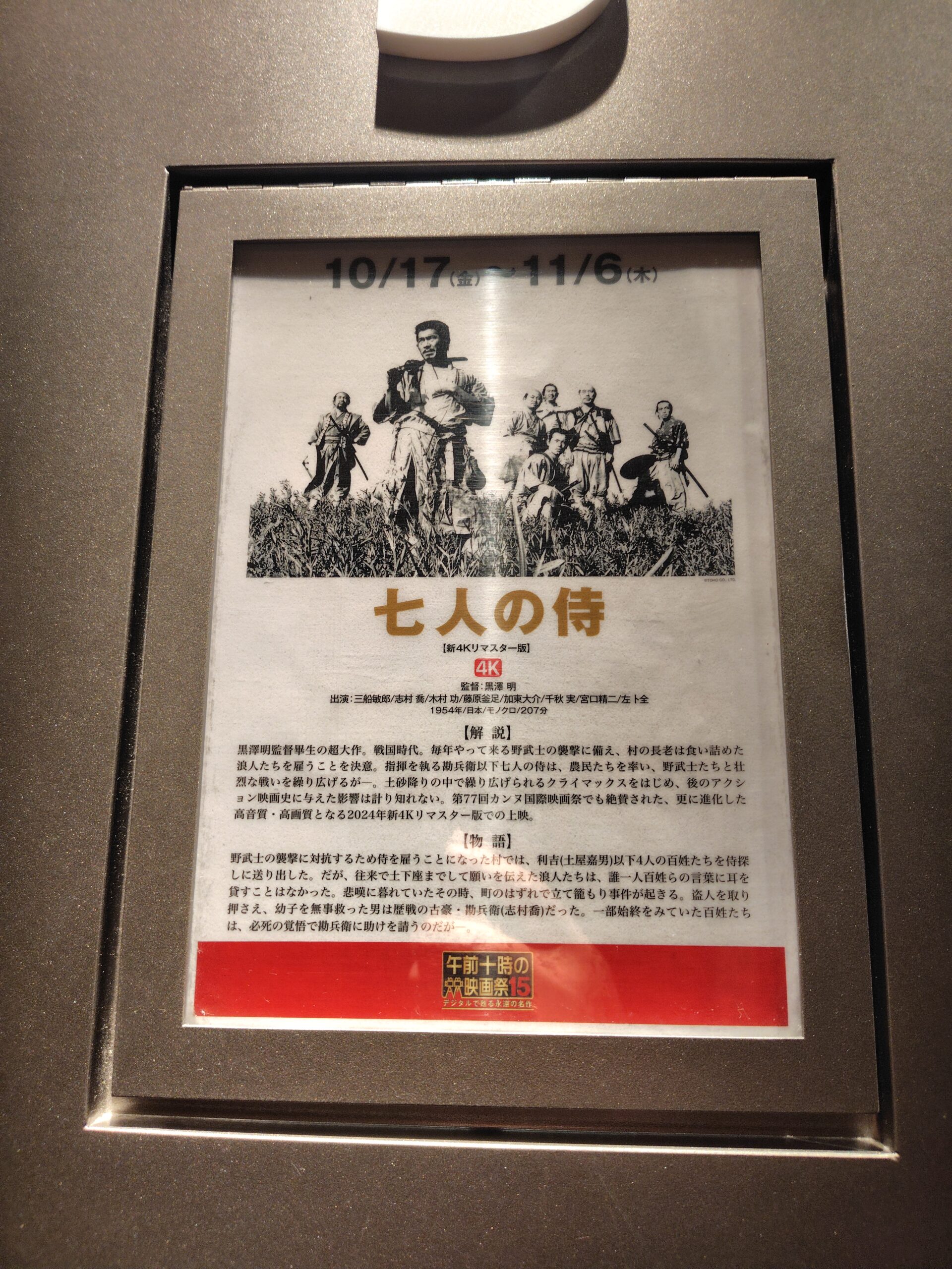 ブログを立ち上げるにあたり、設定やら何やらで数日間部屋にこもりっぱなしだった。気分転換に映画でも観に行こうと、映画館の上演スケジュールを検索すると、**黒澤明監督の『七人の侍』**が上映されていた。観るには気合がいるけれど、大画面でしか観る気になれない映画でもある。